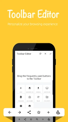 Did you feel uncomfortable because the basic UI provided by the browser? The Banana Browser provides an editing function that allows you to place frequently used functions on the bottom toolbar to suit your taste. You can freely arrange and use your favorite functions such as bookmark, go back, add tab, refresh, and dark mode and so on.
