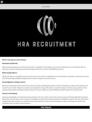 We are passionate about recruitment and all of our candidates. This enables us to match the right person to the right job. We are driven to succeed in finding new clients and opportunities for ourselves and HRA Recruitment.