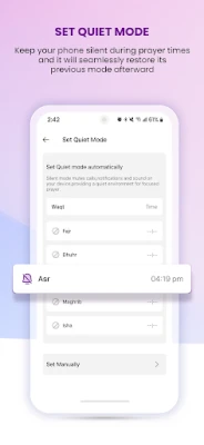 Quiet mode: The 'Quiet' mode lets you specify periods when your phone will remain silent, providing a peaceful environment for uninterrupted prayer.