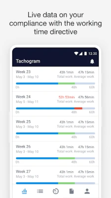 Tachogram automatically calculates remaining working time taking into account all aspects of EC regulations. Follow your remaining driving time, daily and weekly rest times.